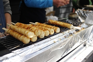 きりたんぽ(切蒲英・切短穂)とは、潰したうるち米を棒に巻き付けて焼いた餅。