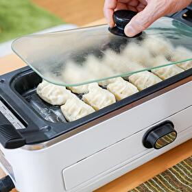 付属するプレートの種類は、肉・魚プレート、深型プレート、焼き網の3種類。深型プレートは、専用のガラス蓋とを組み合わせて、餃子の蒸し焼きや煮込み料理、また、焼き網では餅や焼とうもろこし等々を調理することができます。