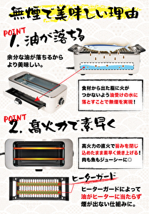 2つ目は、高火力の直火ヒーターに「ヒーターガード」が付いている為、肉や魚の油がヒーターに直接当たらない構造になっている為、ヒーターに油が当たって焦げて煙にならなくなっています。